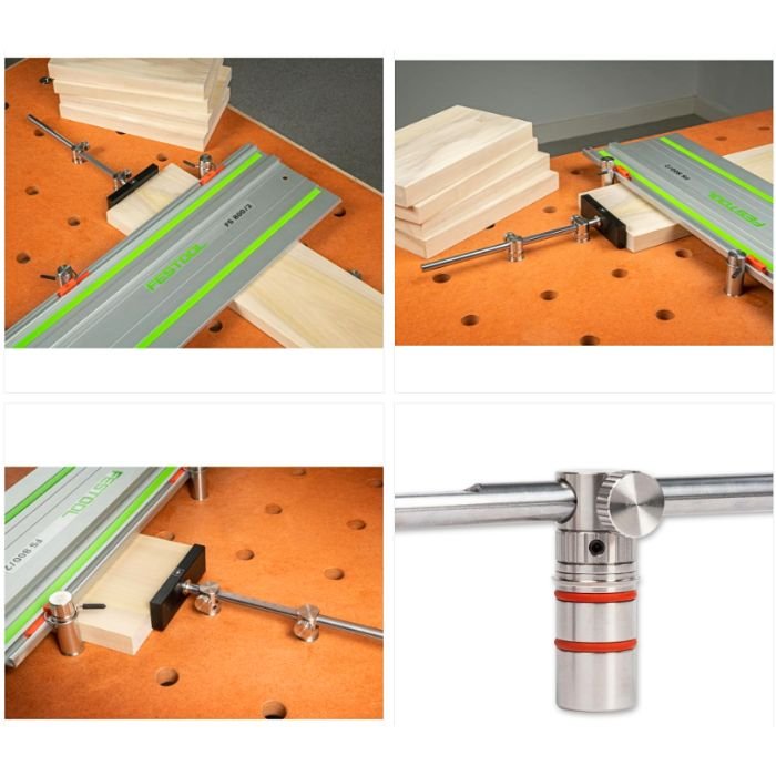 La butée réglable UJK Parf est conçue pour faciliter les coupes répétitives de longueur identique à l’aide d’une scie plongeante et d’un rail de guidage. Compatible avec les établis multifonction Festool MFT/3, MW1000 et UJK, elle s’adapte également aux plateaux réalisés avec le système de gabarit UJK Parf Guide.
