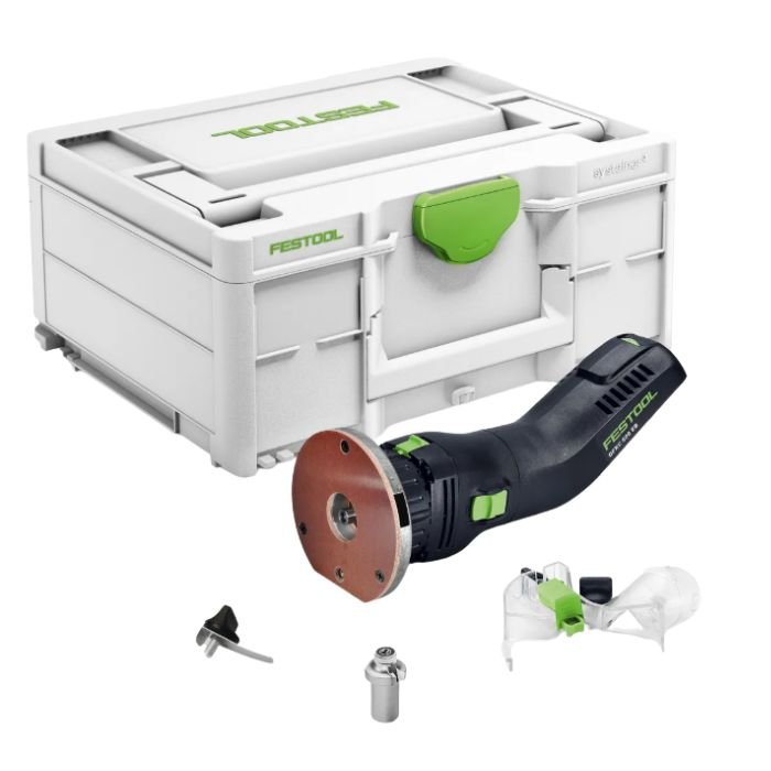 La Festool OFKC 500 R3 EB-Basic est une affleureuse sur batterie très maniable, pensée pour les travaux de chants rapides (stratifiés, plaqués, panneaux). Son centre de gravité équilibré, son design élancé et son réglage de profondeur au 1/10 mm permettent d’obtenir un affleurage net sans basculement ni traces. La connexion rigide fraise/moteur garantit une excellente concentricité, idéale pour les fraises R1 à R6 et les petits chanfreins.